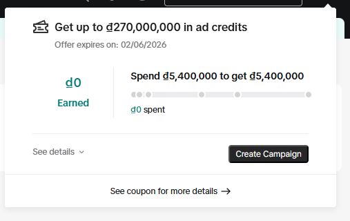 BC3 (Thường - Ko Nhãn AGC) - Trả Sau (Sẵn 1tk có tín 270m) - Info Việt Nam - Tiền VNĐ (V=10%) - TT Mới - Tín Hoàn 270m VND(date: 08/02/2026). Chạy được tất cả mục tiêu (shop + lading) - Đã XMDN 2 bước